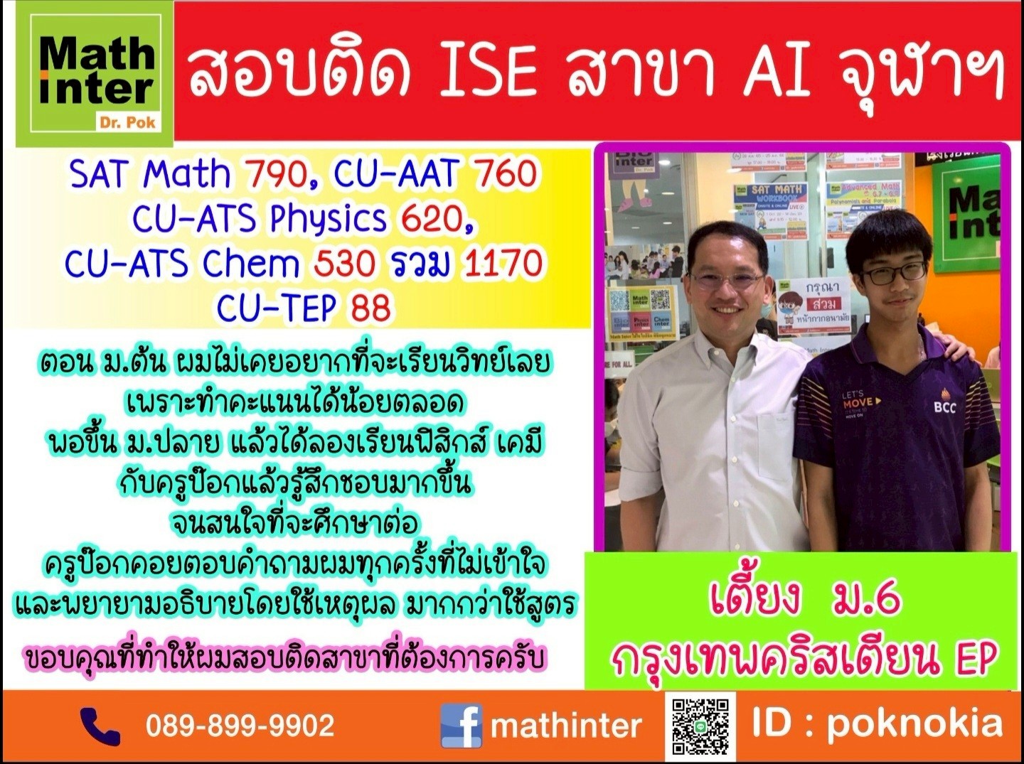 เลข ฟิสิกส์ เคมี ชีวะ และภาษาอังกฤษ เรามีหลักสูตรการเรียนสำหรับน้อง ๆ หลักสูตรไทย เป็นโจทย์ภาษาไทย ระดับ ป. 5 ขึ้นไป เราติวเพิ่มสำหรับวิชา ประวัติศาสตร์ สังคม และภาษาไทย หลักสูตร EP และอินเตอร์ โดยไม่เน้นการใช้สูตรเยอะ น้อง ๆ ที่เรียนกับเราจึงสามารถทำเกรดที่โรงเรียนได้ดีขึ้น และยังทำข้อสอบเข้าในระดับชั้นต่าง ๆ ไม่ว่าจะสอบเข้า ม.1 ม.4 หรือมหาวิทยาลัย ได้แก่ ข้อสอบ เตรียมอุดมฯ มหิดลฯ SAT, CU-AAT, CU-ATS, O-NET, A-level (หลักสูตรไทย-วิชาสามัญ) IGCSE, MUIC, IB, AP, A-Level, IELTSรวมถึง TBAT ได้อย่างง่ายดาย